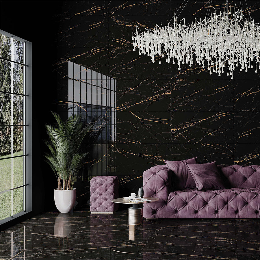 Textura ce imită marmura naturală aduce unicitate în designul interior, iar nervurile aurii ce se întrepătrund pe suprafața neagră conferă un aspect grandios și impresionant. Gresia Bellatrix creează iluzia unei opere de artă sculptate în piatră, învăluind fiecare încăpere într-o atmosferă nobilă și luxuriantă.