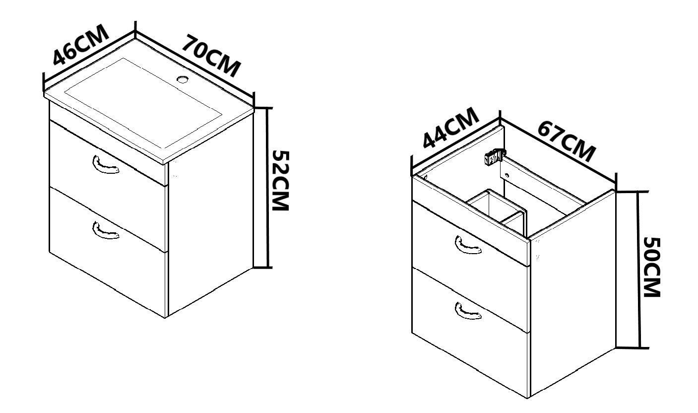 Cutia dulapului este confecționată din PAL, iar fețele sertarelor sunt din PAL vopsit. Grosimea lateralelor și a sertarelor este de 16 mm.