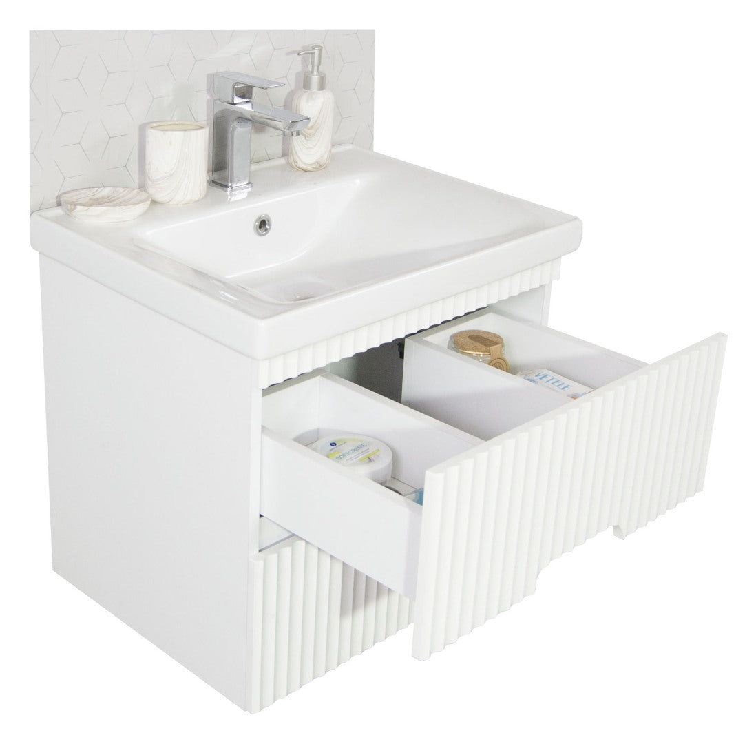 Cutia dulapului este confecționată din PAL iar sertarele sunt din MDF de calitate superioară. Grosimea lateralelor și a sertarelor este de 16mm.