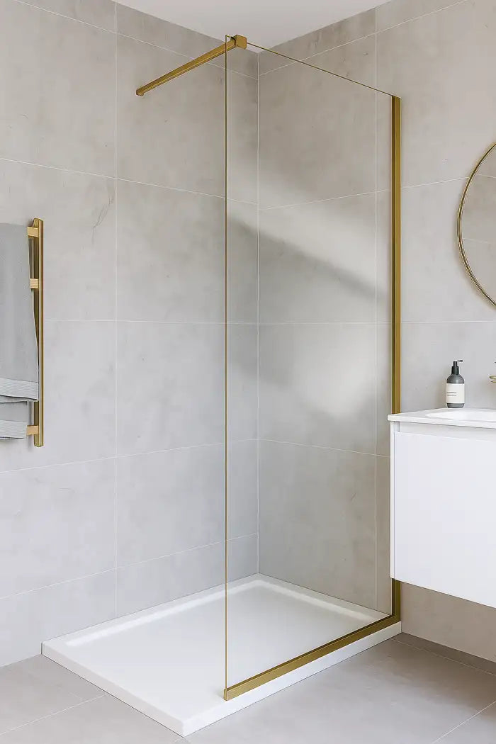 Profilul auriu mat ofera rezistenta si un aspect rafinat, completand perfect designul minimalist al paravanului. Sistemul de fixare este solid si sigur: profilul asigura o prindere ferma atat in perete, cat si in partea inferioara, mentinand stabilitatea structurii.