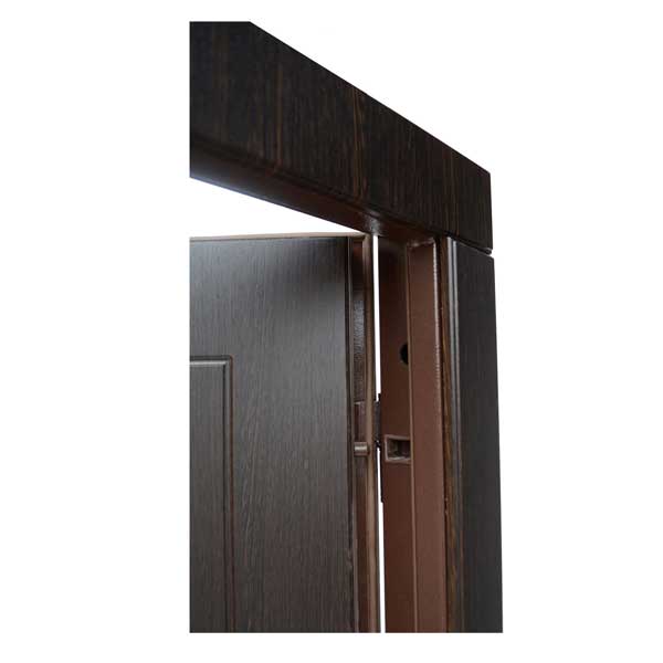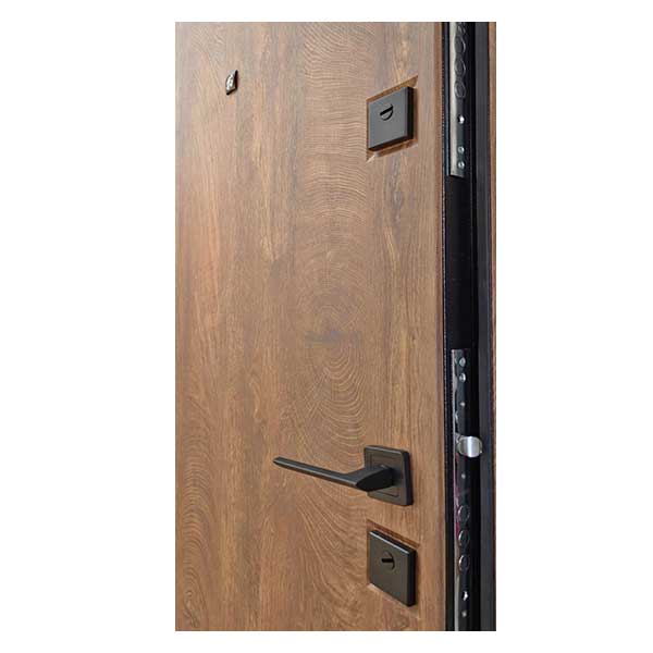Foaie de ușă cu grosimea de 95 mm, realizată din straturi de oțel de 1,5 mm și panouri HDF cu folie PVC, pentru rezistență sporită și durabilitate.